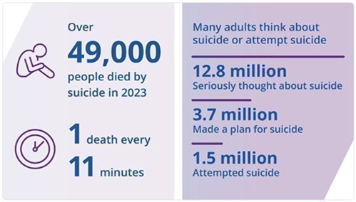 According to the CDC, more than 49,000 people died by suicide in 2023. That is 1 death every 11 minutes. 12.8 million adults seriously thought about suicide. 3.7 million adults made a plan. 1.5 million adults attempted suicide.
